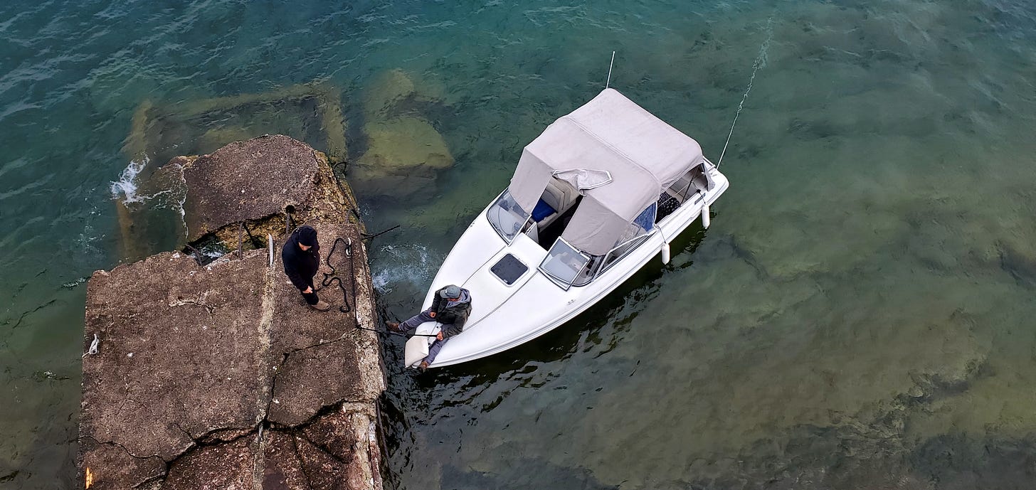 “Well, for one, you’ve got about five miles of unprotected open water from the end of the harbor to the lighthouse. You’ve just seen what that water does to a ferry boat today, let alone a sixteen-foot open fishing boat. Secondly, the dock at the light is pretty much broken up — a real hazard. Our boats are limited to staying within the harbor, and not just to placate the lawyers, but for the safety of our guests.”
