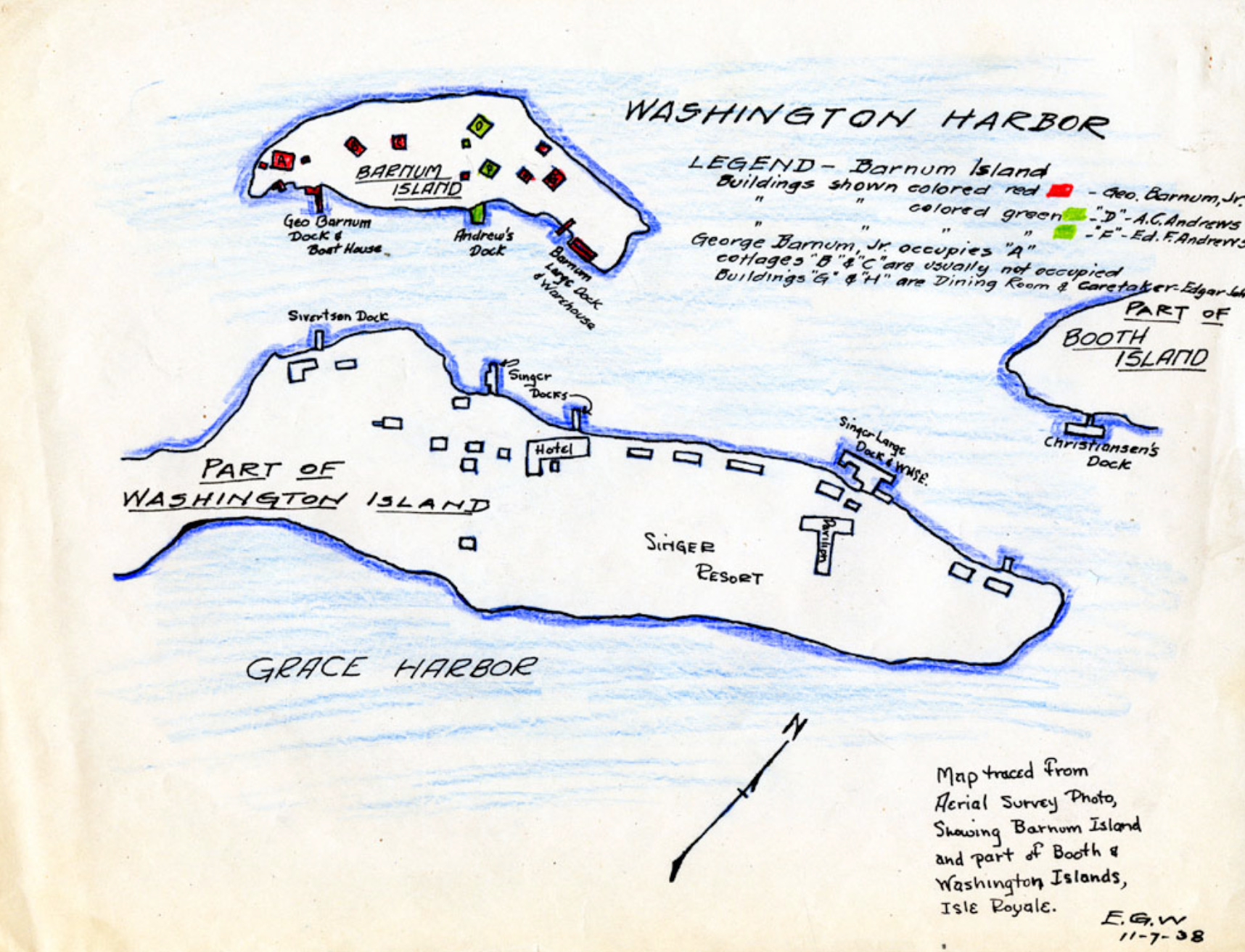 Between the Ozaagaateng (Windigo) dock, where visitors arrive from Grand Portage, and the Rock of Ages Lighthouse lie two islands rich in history. Washington and Barnum Islands, located at the far western end of Washington Harbor, served as important seasonal-use sites: first for Indigenous people engaged in early copper mining and fishing, and later, through the 19th and 20th centuries, for commercial fisheries and private summer cottages.